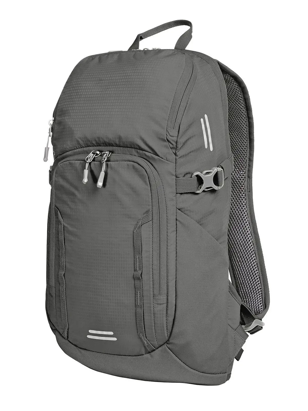 Zaino da giorno e da bici leggero e funzionale, schienale imbottito con sistema a nido d'ape, cinturino al torace regolabile in altezza, cinturino in vita, scomparto principale con zip bidirezionale con tasca a inserto piatta interna, uscita posteriore per cuffie, diverse tasche, cinghie laterali, fascia con cinghia Molle sulla tasca anteriore, stampa riflettente, manico.