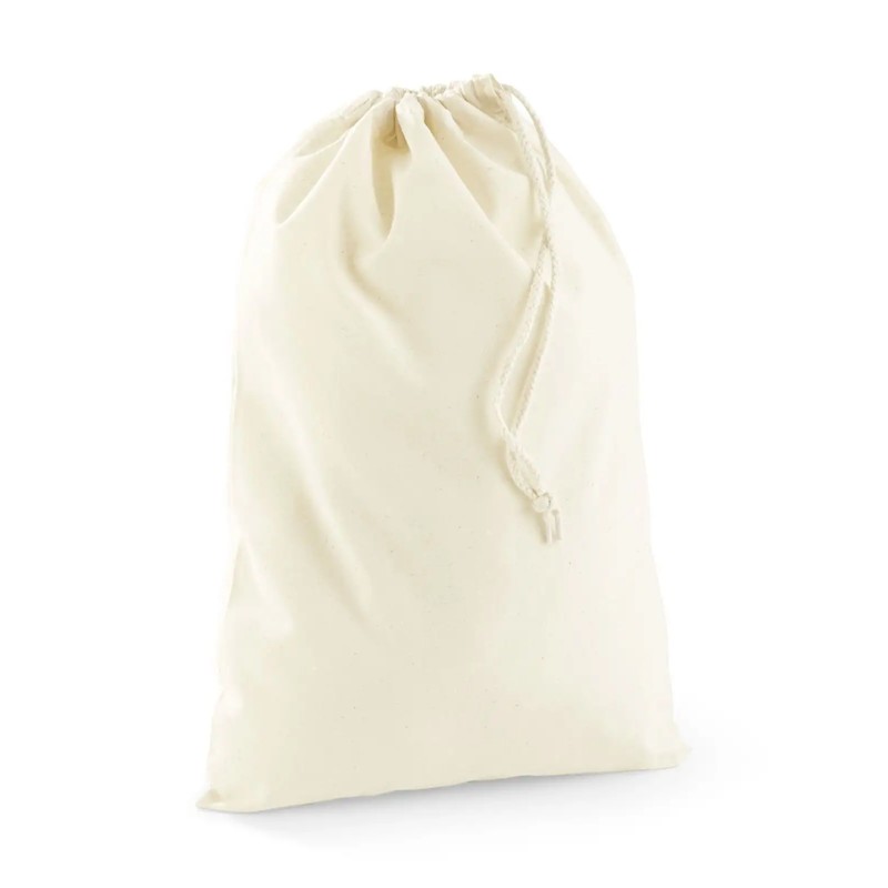 Sacchetto in cotone riciclato GRS, certificato da Control Union CU811033 con cordini in cotone riciclato. Etichetta removibile. Dimensioni: XXS: 10x15 cm, cap. 0,25 lt. - XS: 14x20 cm, cap. 1 lt. - S: 25x30 cm, cap. 3 lt. - M: 30x45 cm, cap. 8 lt. - L: 40x50 cm, cap. 14 lt. - XL: 49x75 cm, cap. 38 lt.