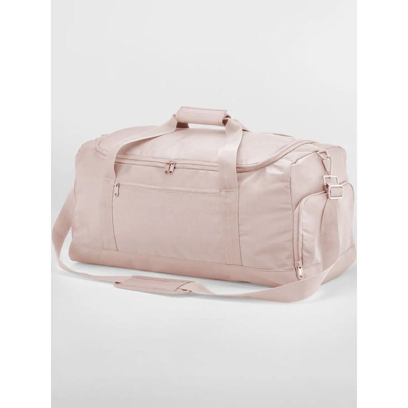 Borsone in poliestere riciclato certificato GRS, pannello base rivestito in PU, apertura con due zip bidirezionali, scomparto porta scarpe, tasca frontale con zip, tasca esterna a rete, tasca interna a rete, maniglia imbottita, tracolla regolabile e removibile. Dimensioni: 55x26x27cm, Capacità : 35 litri, Area di stampa frontale: 12x25 cm massimo, superiore: 40x24cm. Etichetta strappabile.