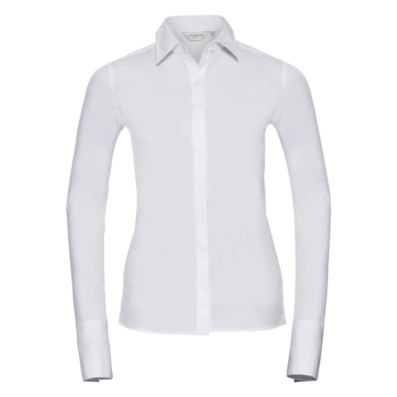 Camicia elasticizzata da donna, leggermente sfiancata. Pence sul retro, pattina stretta e polsini squadrati, controllo dell'umidità . (Col. 30: 125 g/m²)