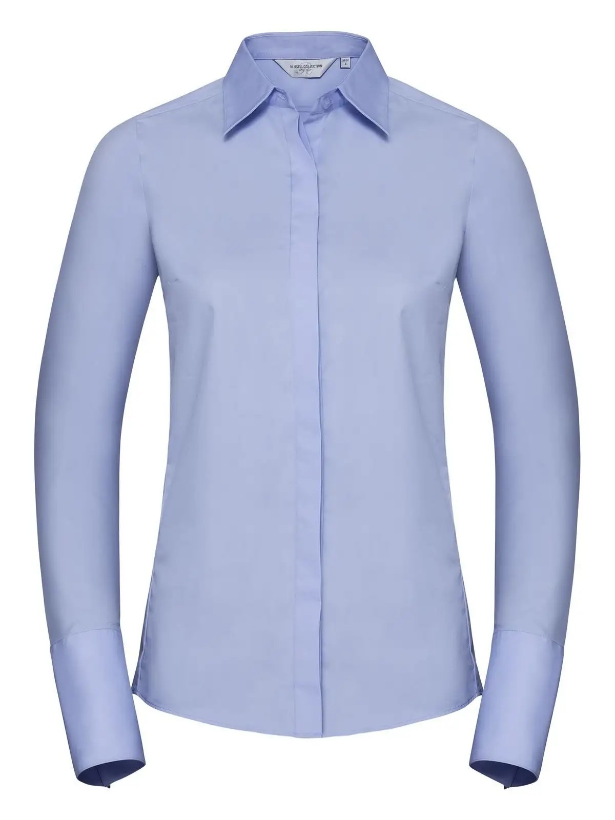 Camicia elasticizzata da donna, leggermente sfiancata. Pence sul retro, pattina stretta e polsini squadrati, controllo dell'umidità . (Col. 30: 125 g/m²)