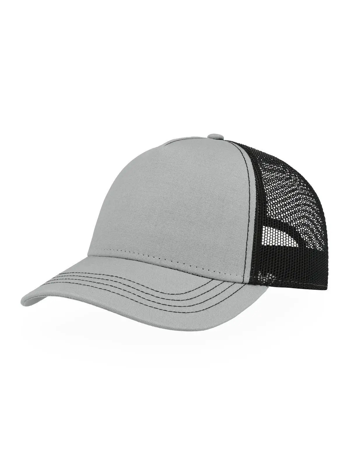 Cappello a 5 pannelli, tela e rete posteriore in poliestere riciclato, visiera mediamente curva, etichetta removibile.