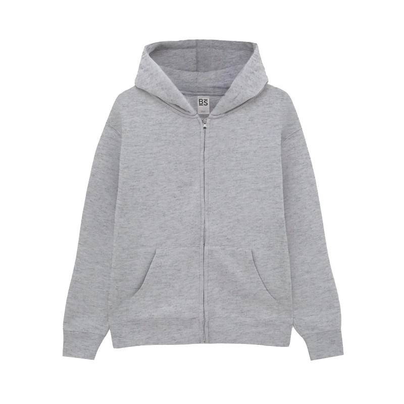 Felpa da bambino, con cappuccio a doppio strato, felpata internamente, maniche set-in, con cerniera tono su tono coperta, occhielli in metallo, cordini con punta in metallo, tasca a marsupio, orlo inferiore e polsini in costina, struttura con cuciture laterali. Etichetta strappabile. Tessuto PST: interno in poliestere ed esterno 100% cotone.
