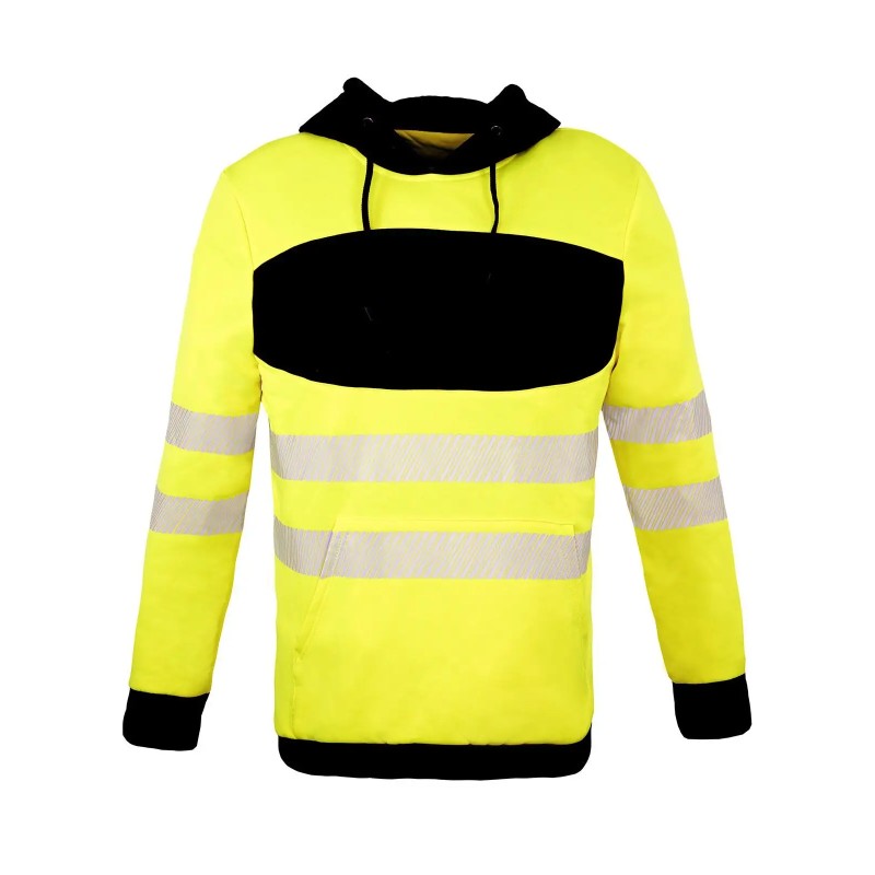 Felpa con cappuccio ad alta vestibiltà , certificato secondo le norme EN ISO 20471:2013/A1:2016 e EN 13758-1:2001 (UPF 40+), materiali STANDARD 100 di OEKO-TEX, due strisce riflettenti segmentate larghe 5 cm intorno al corpo e alle maniche polsini e orlo a costine nere, ampia area di stampa sul petto, tasca a canguro.
