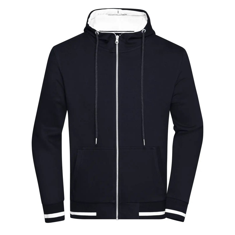 Giacca con cappuccio e cerniera. Tessuto esterno (300 g/m²).Tessuto morbido e di alta qualità, internamente felpato, polsini a maglia di elastan, strisce contrastanti nei polsini e in vita, cappuccio a due strati contrastanti, cerniera metallica YKK, tasca a canguro.