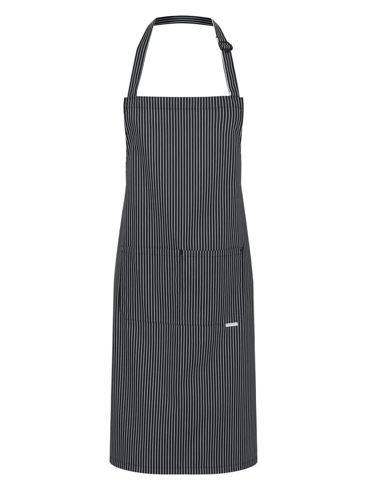 Grembiule Carlo, cotone twill, 185 g/m² tessuto rifinito, irrestringibile, stampato a colori a righe bianche - grembiule con pettorina con cinta dello stesso tessuto del grembiule, con cucitura rinforzata - fibbia per regolazioni di lunghezza fino a 70 cm - tasca cucite con 2 scomparti, 34 x 18 cm.