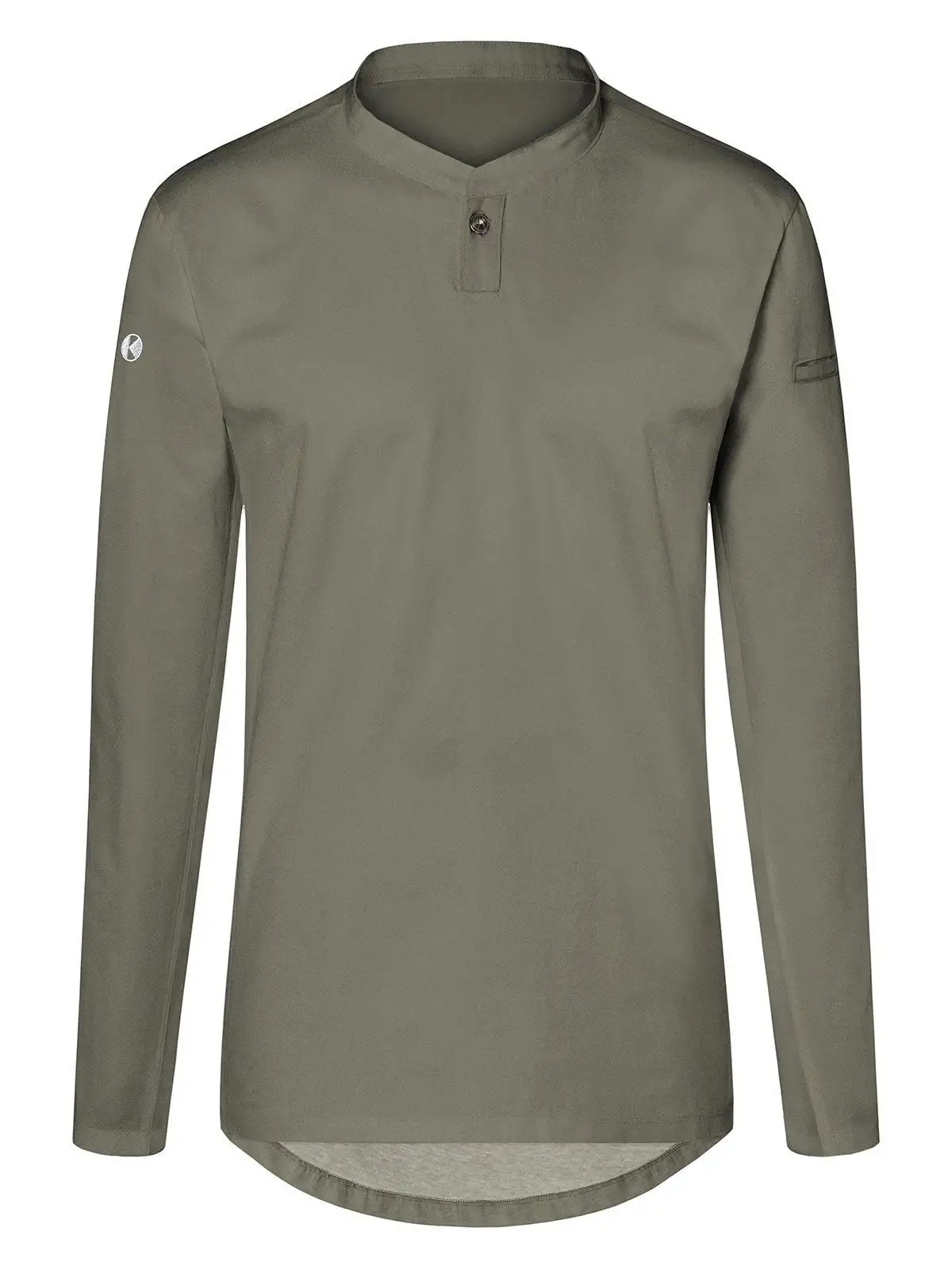 Moderna t-shirt da lavoro a maniche lunghe, traspirante e con regolazione dell'umidità, slim-fit, sciancrata in vita, colletto alto e abbottonatura corta, taschini con bottone, a filetto sul petto e sulla manica.