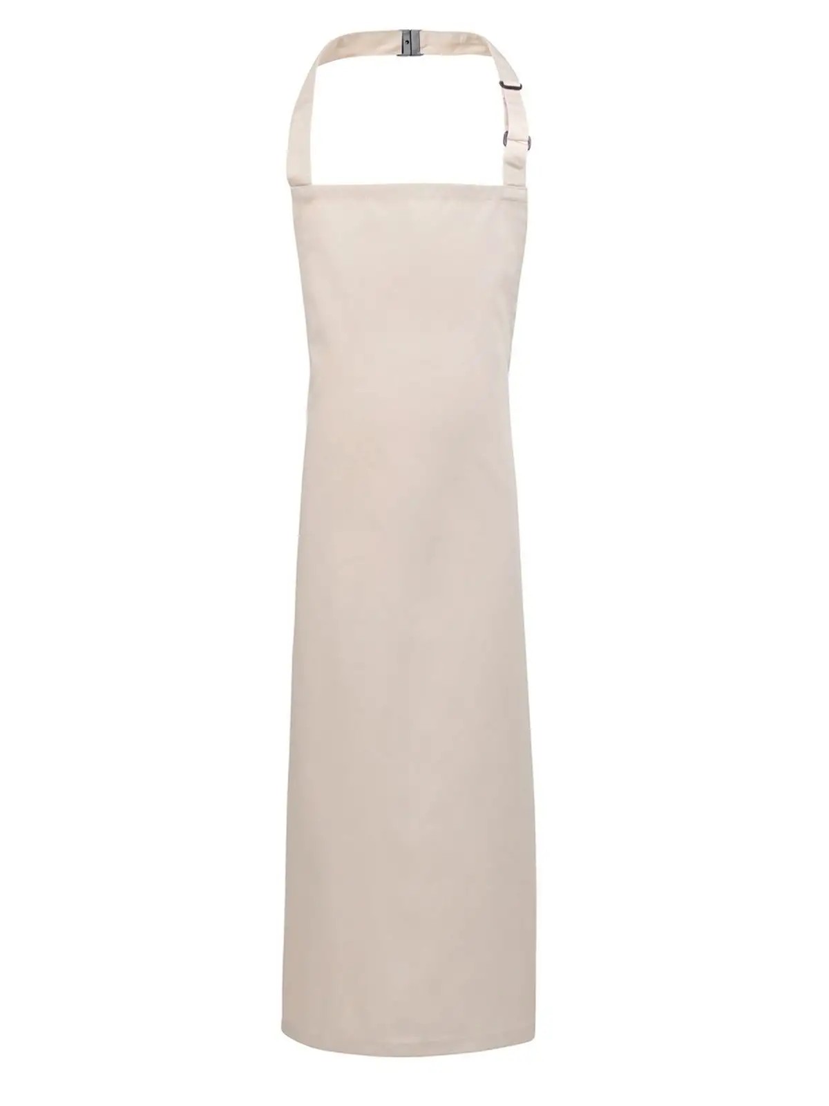 Grembiule con pettorina in twill, senza tasca, laccio al collo regolabile con fibbia, allacciatura posteriore con lacci di 50 cm. Lavabile in lavatrice domestica a 60° e 85° in lavatrice industriale.