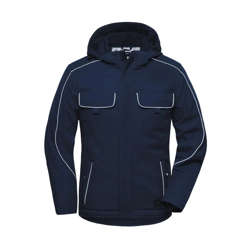 Giacca in softshell robusta e resistente, antivento e idrorepellente (colonna d'acqua 2,000 mm), traspirante e permeabile al vapore (2,000g/m²/24h), collo alto con morbido pile interno, cappuccio removibile e regolabile, maniche ergonomiche, polsini interno manica, retro esteso, zip interna nascosta con protezione per il mento, tasche laterali con zip e tasche interne, tasche sul petto con cucitura su un solo lato per facilitare la decorazione, dettagli riflettenti (senza funzione protettiva, senza DPI) su tasche, maniche, spalle e sul retro, zip YKK. Per evitare che il prodotto si rovini, bottoni e zip sono nascosti.